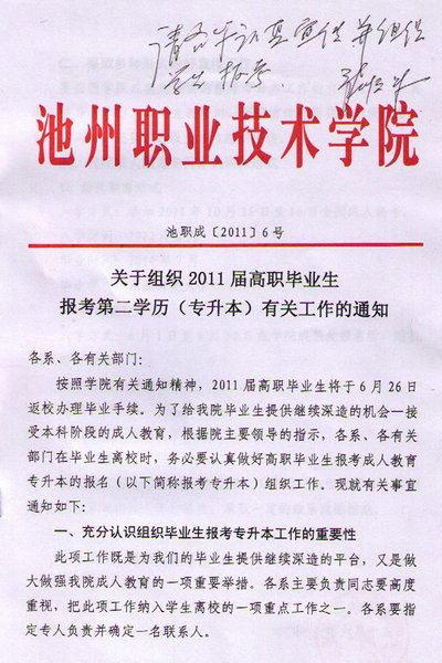 关于组织2011届高职毕业生报考第二学历(专升本)有关工作的通知